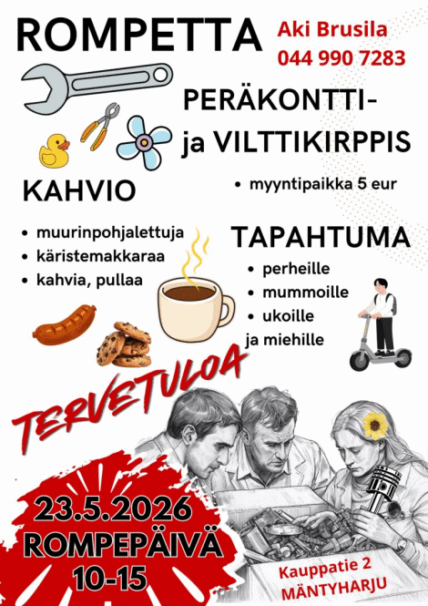 Lauantaina 23.5.2026 kello 10–15. pidetään rompepäivä osoitteessa Kauppatie 2, 52700 Mäntyharju.